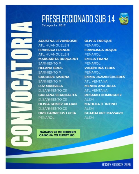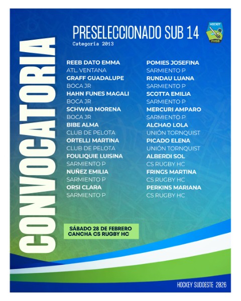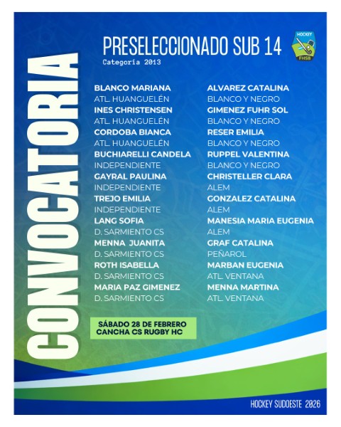 Convocatoria preseleccionado S La DT Noelia FarÃas convoca a las jugadoras del preseleccionado Sub 14 a un nuevo entrenamiento. Cancha de CS Rugby HC Sábado 28 de fe[...]